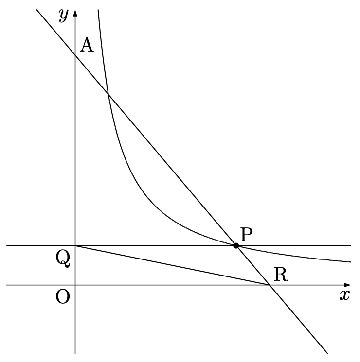 グラフは $\displaystyle y=\frac{12}{x}\ (x>0)$ で $\mathrm{A}$ の $y$ 座標は $10$、$\mathrm{P}$ はグラフの $y$ 座標が $10$ より小さい部分を動く点です。また、$\mathrm{P}$ を通って $x$ 軸に平行な直線と $y$ 軸の交わる点が $\mathrm{Q}$、直線 $\mathrm{AP}$ と $x$ 軸との交点が $\mathrm{R}$ となります。
