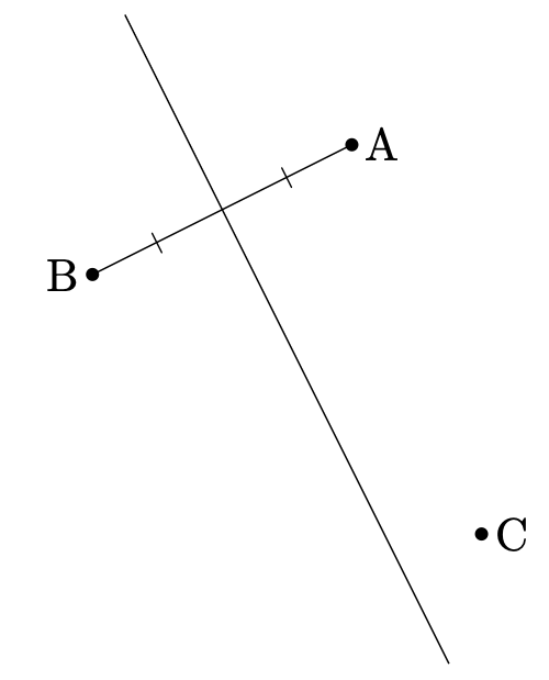 - 線分 $\mathrm{AB}$ の垂直二等分線を $l$ とすると、点 $\mathrm{P}$ は $l$ 上にある。