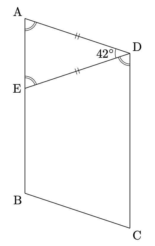 (1)は $\mathrm{AD=ED}$、$\angle\mathrm{ADE}=42^\circ$ のときの $\angle\mathrm{EDC}$ の角の大きさを求める問題でした。