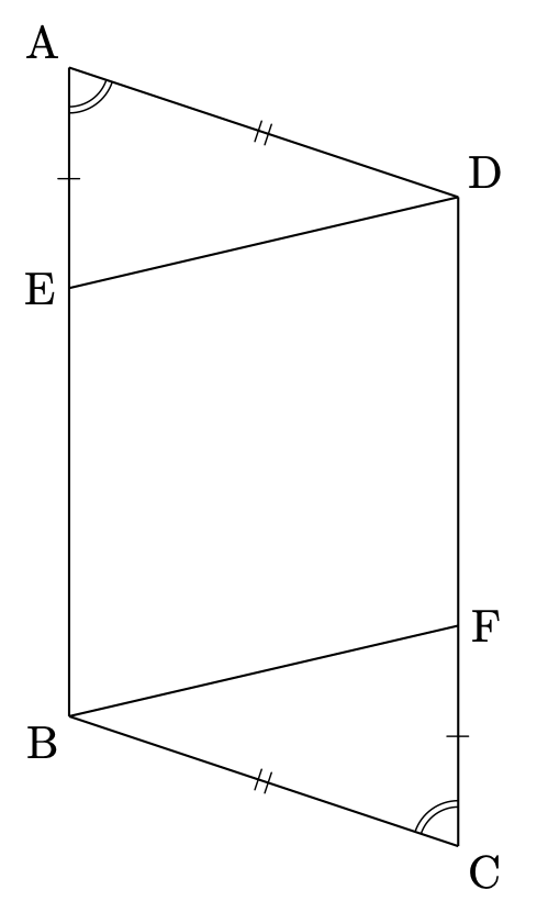 となり、$\triangle\mathrm{AED}\equiv \triangle\mathrm{CFB}$ がすぐに示せます。