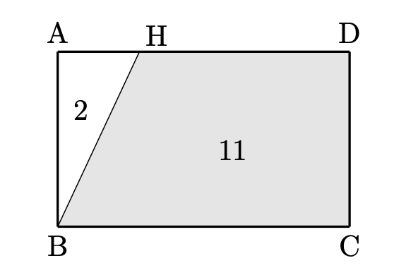 すなわち、$\triangle \mathrm{ABH}$ の面積は四角形 $\mathrm{BCDH}$ の面積の $\displaystyle \frac{2}{11}$ となります。すなわち面積比は $2:11$ となります(下図)。