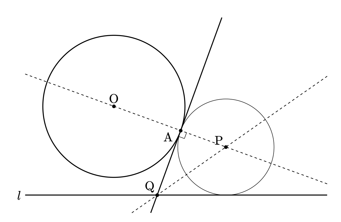 - 条件3: $\mathrm{P}$ を中心とする円は、直線 $l$ と接する。