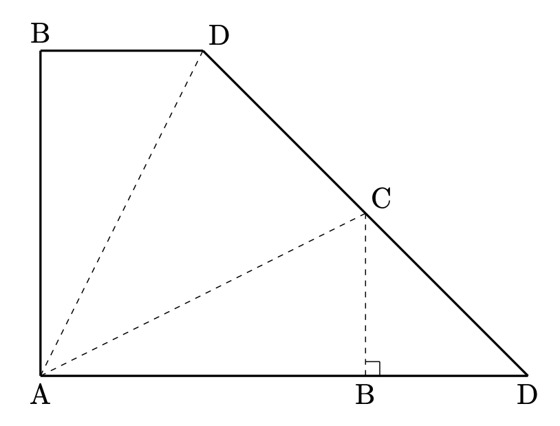 まずは、$\triangle \mathrm{ACD}$ を求めていきましょう。これは、図から $\mathrm{DC=CD}$ が瞬時に分かるので、$\triangle\mathrm{ADC}$ を求めればOKとわかります。