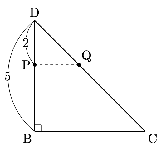 底面は $\triangle \mathrm{PQD}$ と $\triangle \mathrm{BCD}$ の相似を利用します。相似比は図からすぐに $2:5$ とわかります。したがって、面積比は