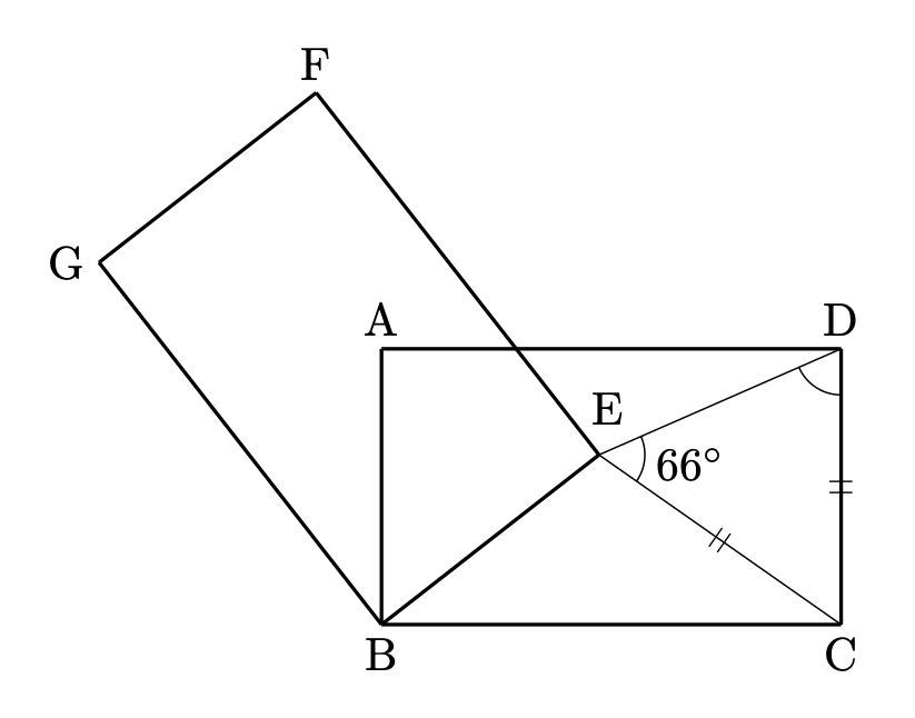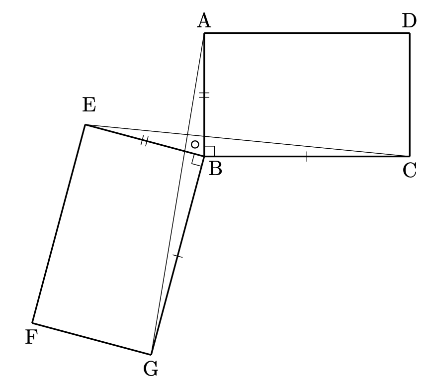 仮定からすぐに、$\mathrm{AB} = \mathrm{EB}$、$\mathrm{BG} = \mathrm{BC}$ が分かります。