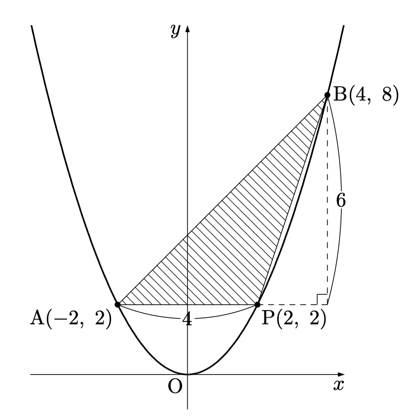 まず、各点の座標を求めます。$\mathrm{A}(-2,\ 2)$、$\mathrm{B}(4,\ 8)$、$\mathrm{P}(2,\ 2)$ はサッと計算して出しておきましょう。