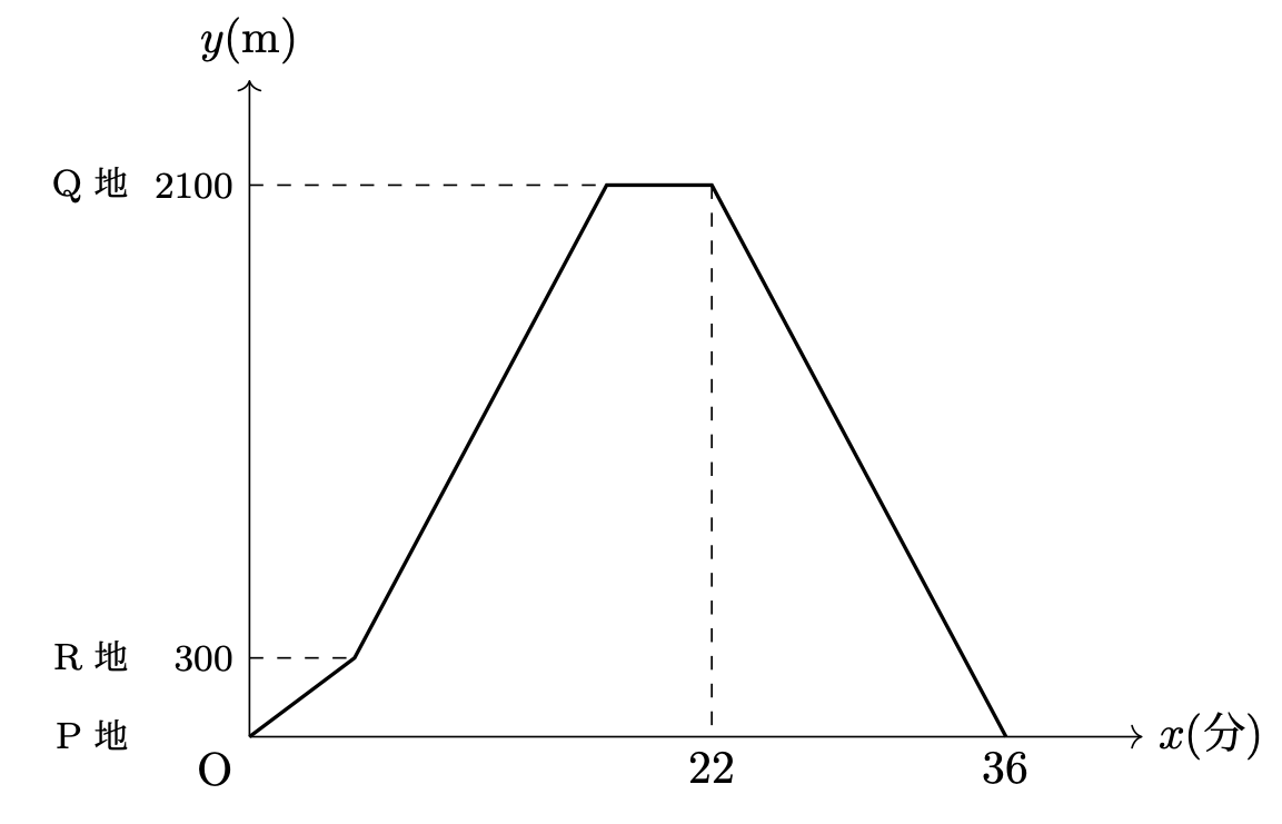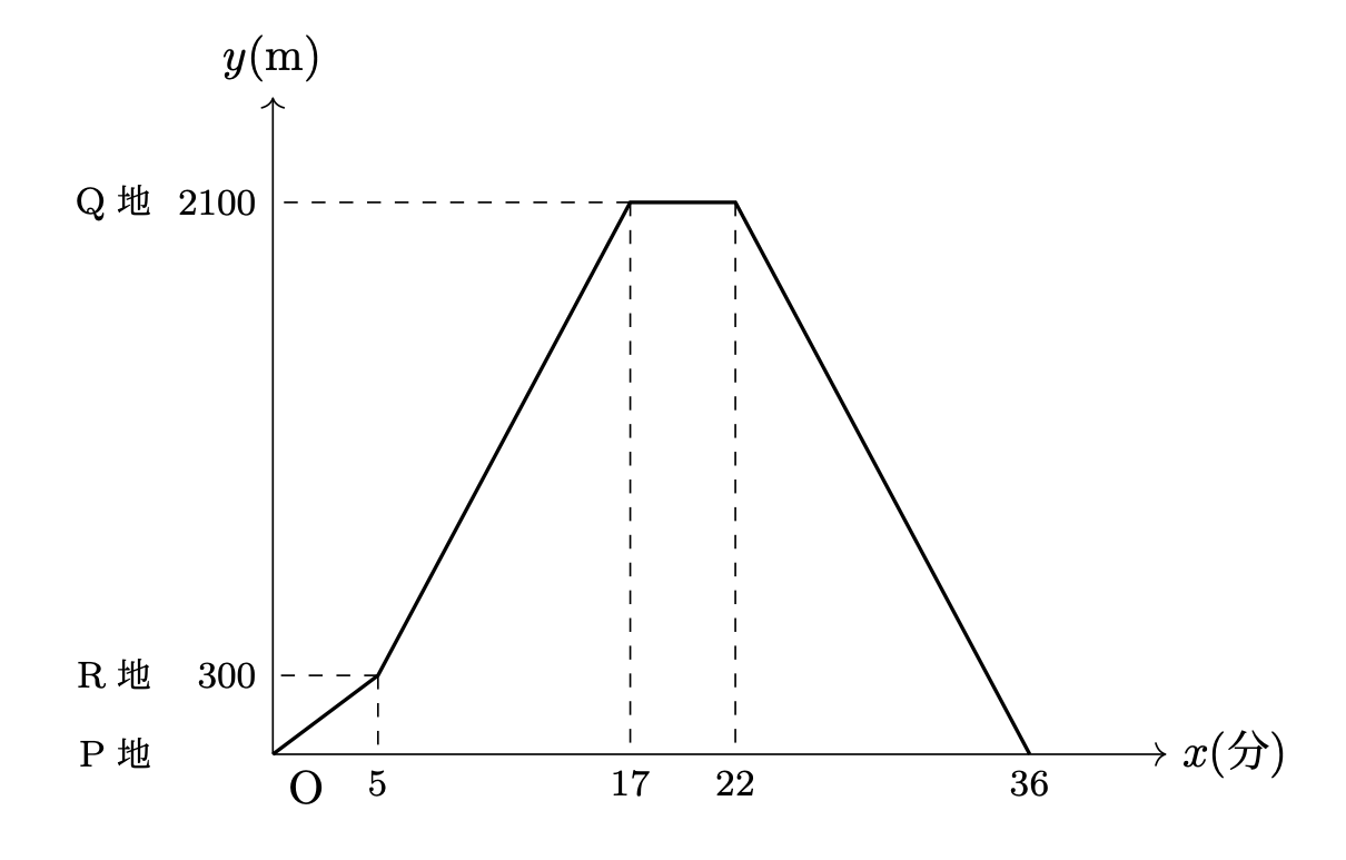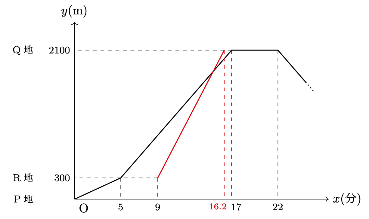 中途半端なグラフなので、問題文からサクッと大事な座標は出しておきたいですね。R地まで分速60mで進んでいるので、300m進むのに5分かかります。さらに、RからQまでは分速150mで、1800m進むことになるので、12分かかります。つまりQ地点についたときは最初から17分後となります。