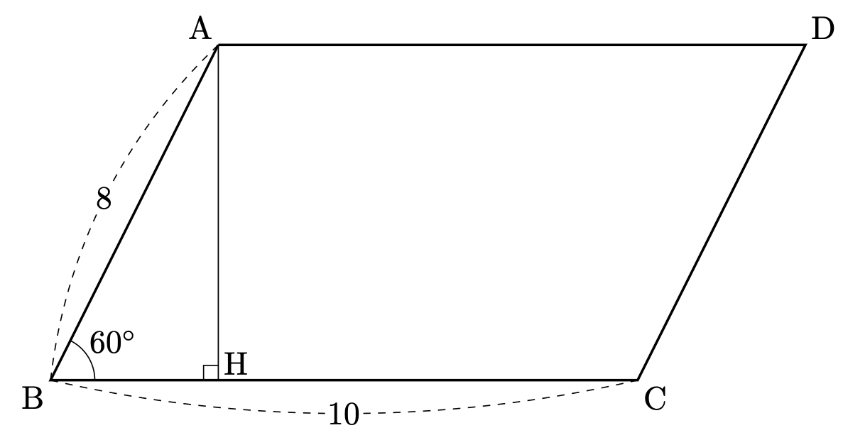 $\mathrm{A}$ から $\mathrm{BC}$ に垂線 $\mathrm{AH}$ を下ろすと、$\angle \mathrm{HBA}=60^\circ$ なので $\triangle\mathrm{ABH}$ は $1:2:\sqrt{3}$ の直角三角形になります。