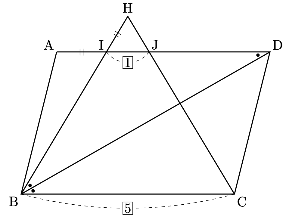 さらに $\triangle \mathrm{HIJ} \sim \triangle \mathrm{HBC}$(相似比1:5)と $\mathrm{AI=HI}$ を組み合わせます。少し複雑ですが、$\mathrm{I}$ が $\mathrm{AD}$ を $1:4$ に内分する点となります。$\mathrm{HI:IB=1:4}$ であり、$\mathrm{IB=ID}$、$\mathrm{AI=HI}$ から $\mathrm{AI:ID}=1:4$ が得られます。$\mathrm{AD}$ 上と $\mathrm{BC}$ 上の分割数が揃っていることに注意して、