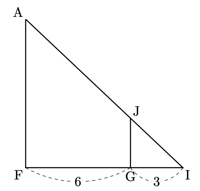 鍵となるのは点 $\mathrm{J}$ の位置です。これを考えるために、まずは下のような図(平面 $\mathrm{AFI}$)を考えます。