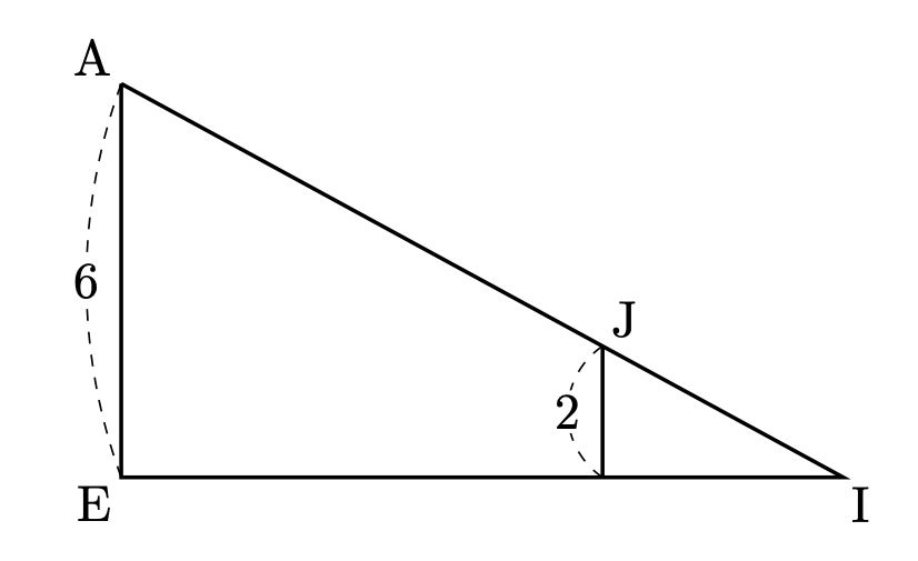 $\mathrm{A}$ の高さ $6$、$\mathrm{I}$の高さ $0$ であり、$\mathrm{A}$ から $\mathrm{I}$ に向かって $\dfrac{2}{3}$ 進むので、高さも $\dfrac{2}{3}$ 下がります。したがって、$\mathrm{J}$ は、底面から $2$ だけ上の高さにあります。