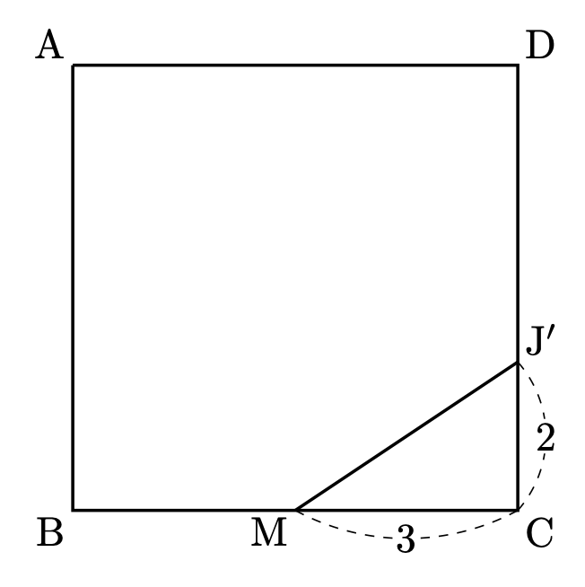 再度真上から見た図を考えます。$\mathrm{M}$ を通って平面 $\mathrm{ABCD}$ に平行な面に $\mathrm{J}$ を投影した点を $\mathrm{J}'$ とします。このとき、三平方の定理から
